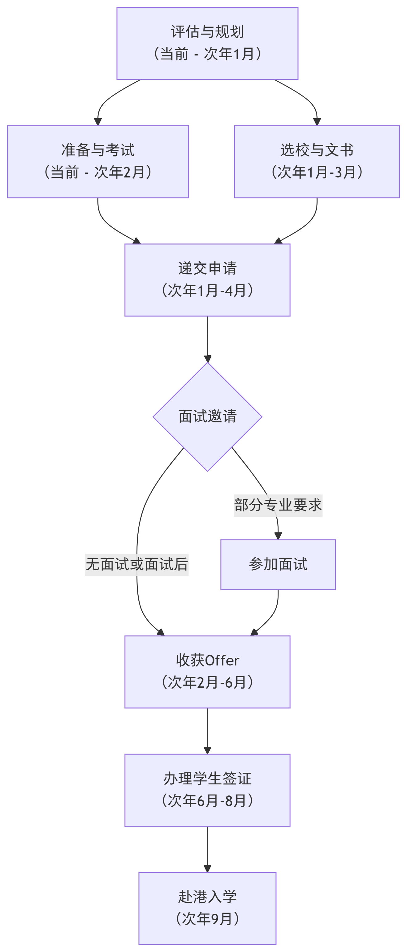 香港进修申请的典型流程和时间线如下(以次年9月入学的硕士课程为例):